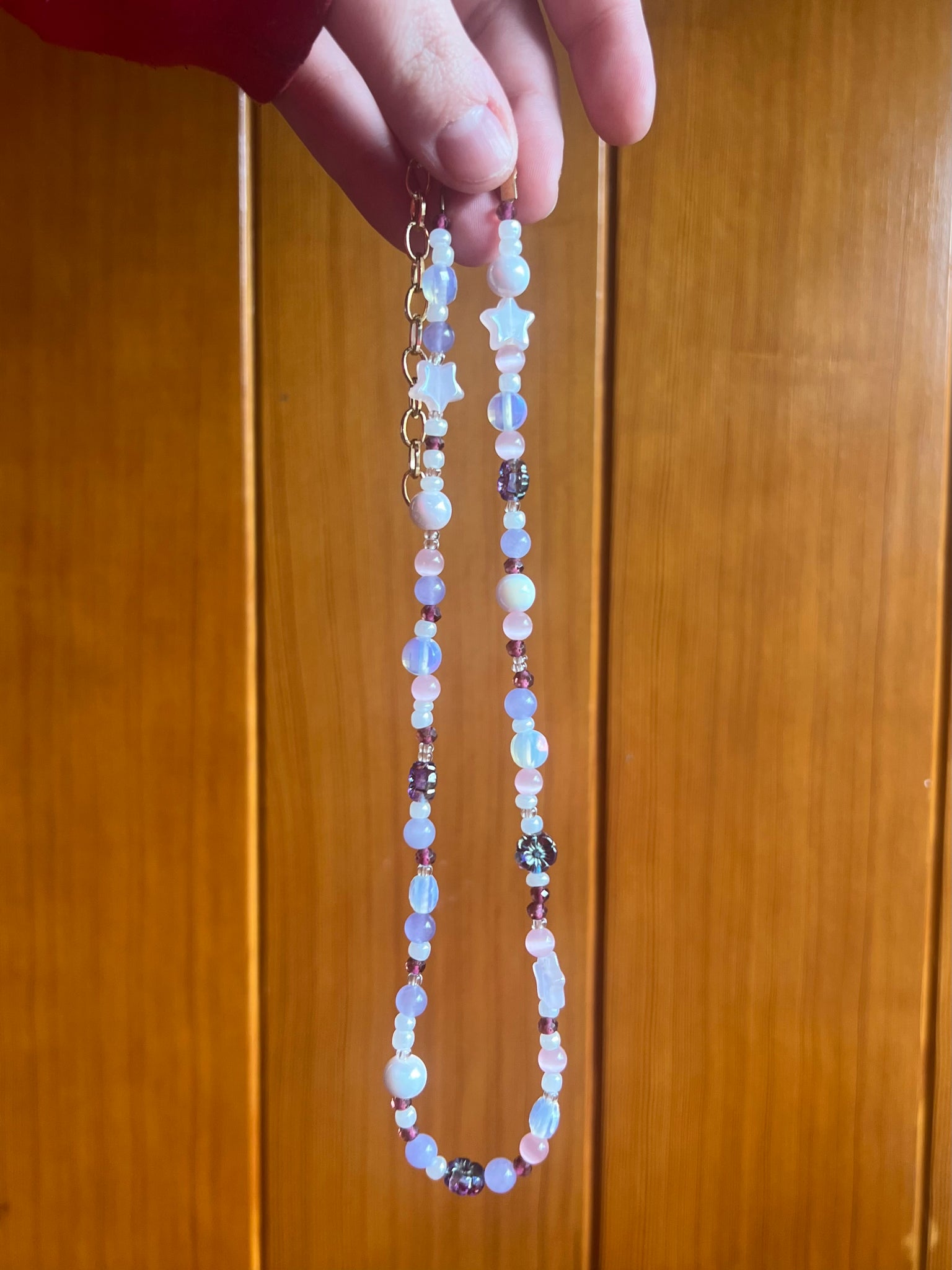 This design features some glass and polite beads! I Think I’ve bought 5 strands of the opalites… they go perfect with everything!