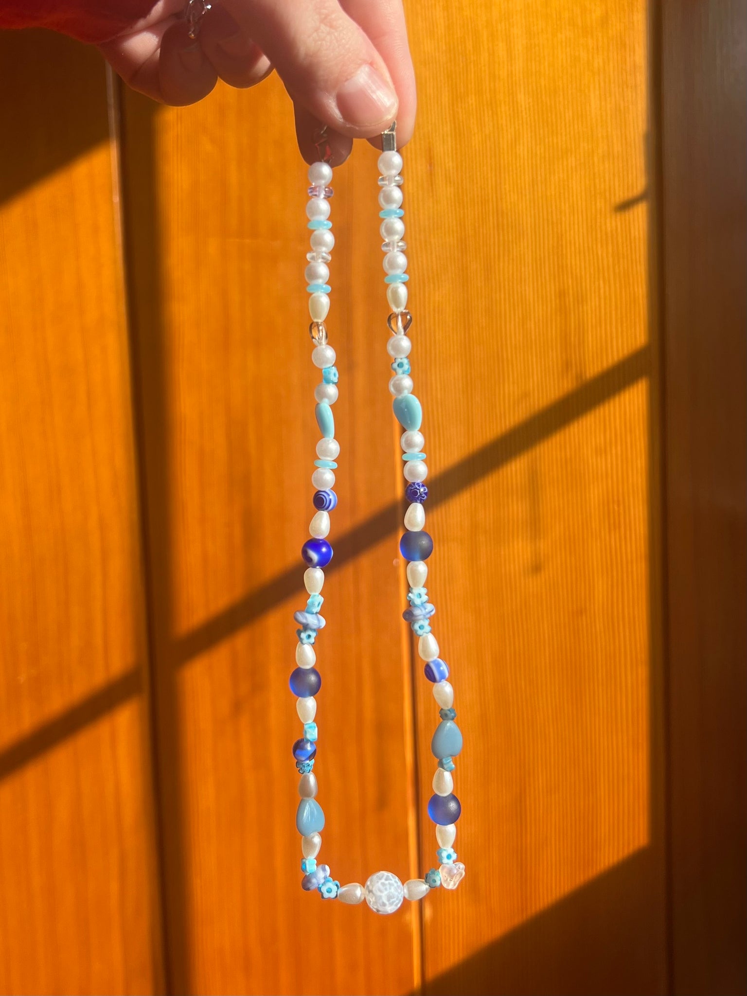 This wintery design features blue and white beads from all over! Featured are some blue lamp work glass beads, handmade in the Czech Republic.